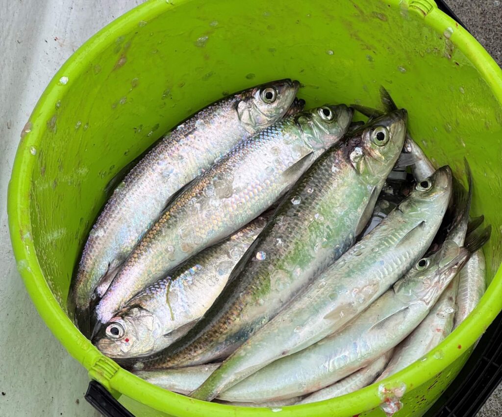 Vi fik samlet en spandfuld sild. Det blev til 55 sild, fanget på et par timer.