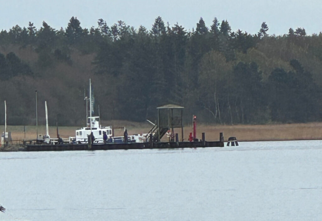 Fra Mellerup er der udsigt til Voer færgehavn. En lille færge sejler i pendulfart mellem Mellerup og Voer på Randers Fjord. En tur på et par minutter.